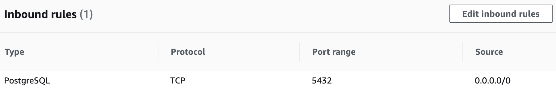One way to ensure connectivity is to create an inbound rule for TCP on port 5432 and to configure the database to be publicly accessible.